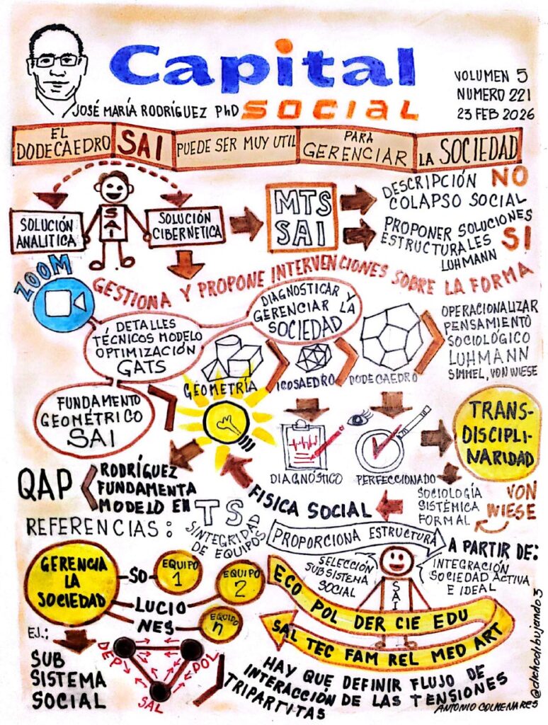 La geometría nos permite operacionalizar el pensamiento sociológico de Luhmann, Simmel y von Wiese, en el marco de un sistema cibernético integral (la cibernética de Beer), al apoyarnos en el Dodecaedro para gerenciar la sociedad. Previamente, con el Icosaedro (la tensegridad de Fuller) hacemos el diagnóstico, perfeccionándolo con el Dodecaedro Romo (compuesto UC69-152: interacción entre triángulos y pentágonos). En esta demostración de transdisciplinariedad debo admitir que, como ingeniero que soy, la idea de fundamentar mi modelo matemático en el QAP provino de la sociología sistemática y formal de von Wiese, quien sugería una física social.